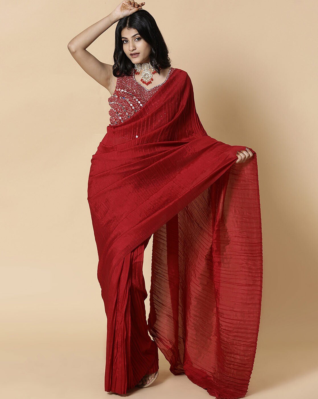 Women Pleated Georgette Saree with Embellished Blouse